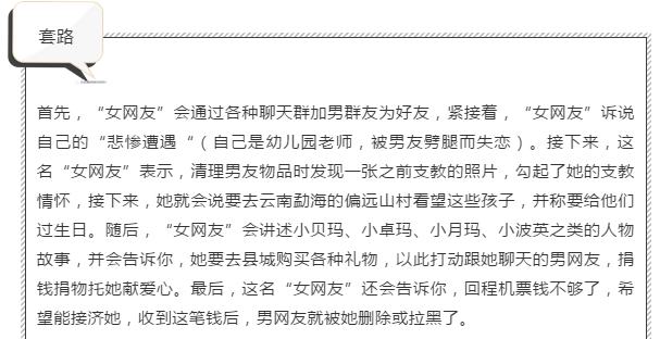近日,常州市警方接到了多起报警,都是一陌生女性声称失恋后去云南支教,从而骗取市民钱财的报警。警方通过初期侦查发现,这的确是一个骗局,而且已经比较老套了,背后很有可能存在一个专门拍摄的团体,这样的套路在全国很多地方都有人中招。