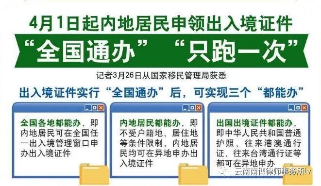 自2019年4月1日起中华人民共和国普通护照、往来港澳通行证、往来台湾通行证等出入境证件实行“全国通办”,即内地居民可在全国任一出入境管理窗口申请办理上述出入境证件,申办手续与户籍地一致。出入境证件实行“全国通办”后,可以实现三个“都能办”:全国各地都能办,即内地居民可在全国任一出入境管理窗口申办出入境证件,申请材料与户籍地一致;内地居民都能办,即不受户籍地、居住地等条件限制,内地居民均可在异地申办出入境证件;出国出境证件都能办,即中华人民共和国普通护照、往来港澳通行证、往来台湾通行证等都可在异地申办。据悉,这次推出的新举措包括异地申办赴港澳台团队旅游签注可在自助签注机上办理,立等可取。