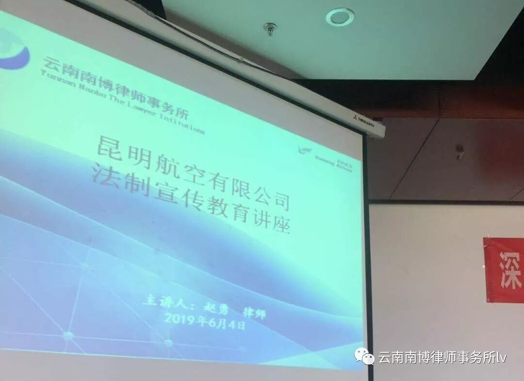 2019年6月4日,我所赵勇主任受邀到昆明航空有限公司开展法制宣传教育讲座,为昆明航空有限公司开展2019年空勤人员法制宣传教育工作。