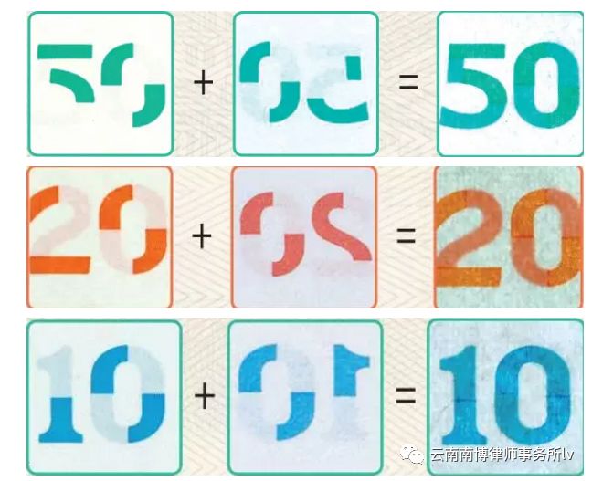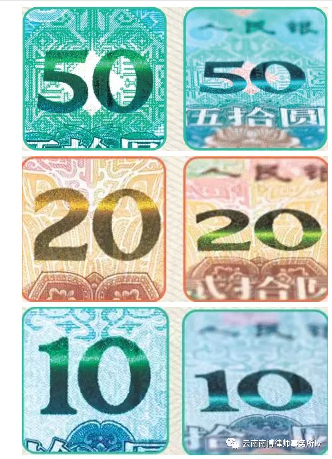 转动钞票,面额数字“50” “10”的颜色由绿变蓝,“20”的颜色由金变绿。 ![]() |