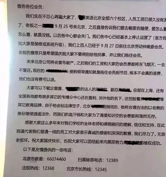 近日,网传一份落款为“有良心的XX英语员工”的公告掀起轩然大波,《公告》称XX英语北京公司将宣布破产,北京各中心已以装修或系统升级的名义停止运营,学员会员费与员工工资均无处追讨。上百名员工已经前往北京劳动仲裁委员会。昆明XX英语的主页上显示,XX英语创立于1998年,是一家提供专业高端英语培训的教育集团,目前已在北京、上海、广州、深圳等全国近60个城市开设了120多所培训中心。10月17日最新消息称昆明市XX英语目前已经关门停业。据了解,XX英语学员的一部分学员采用了贷款的形式缴纳学费,需每月分期付款到各分期贷款的平台,现如今能否继续上课也未可知,学费能不能退也成为了一个大难题。(综合整理自云南新闻网、YNTV2都市条形码、都市时报、澎湃新闻)