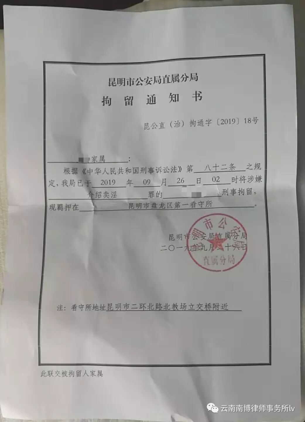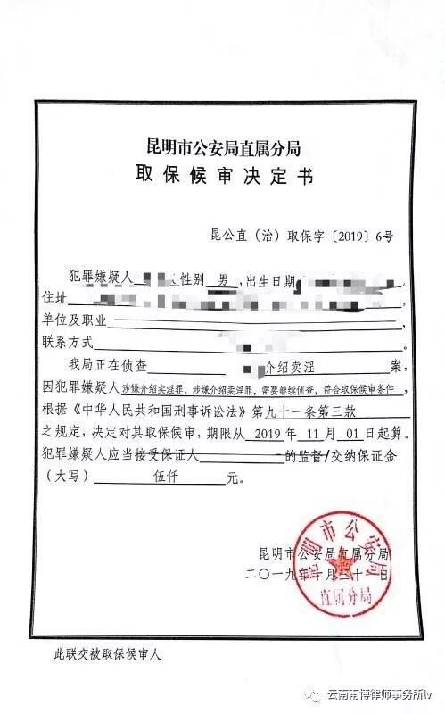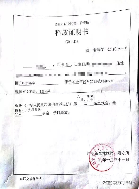 犯罪嫌疑人毛某因涉嫌介绍卖淫罪被刑事拘留,云南南博律师事务所赵慧敏律师在接受家属委托后展开工作,多次到看守所会见了嫌疑人了解案情,在充分了解案件事实的基础上,赵慧敏律师向侦办此案的公安机关提出了取保候审申请,但公安机关不予取保。后公安机关向检察院提请对嫌疑人毛某批准逮捕,赵慧敏律师向检察院提交了不予逮捕的法律意见书,被检察院予以采纳,最终不予逮捕,毛某于10月31日被释放!