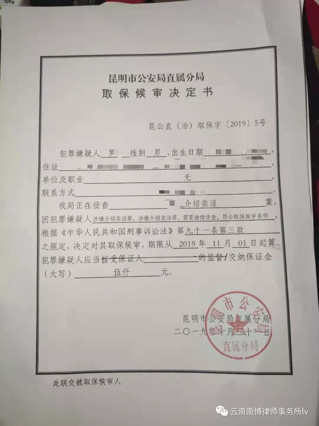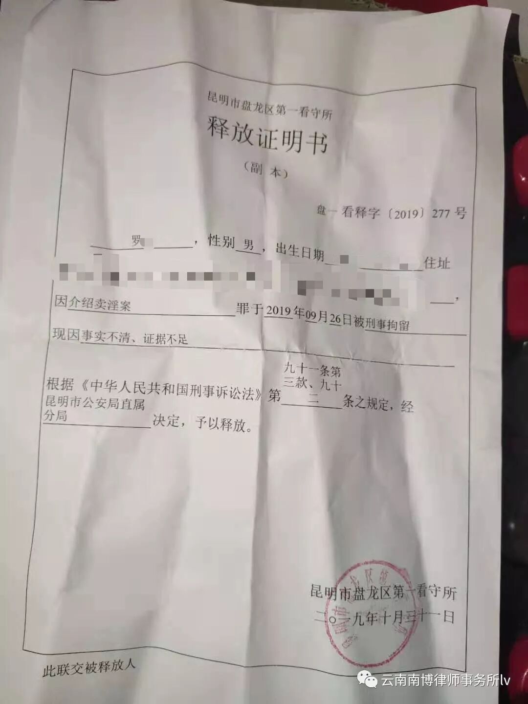 犯罪嫌疑人罗某因涉嫌介绍卖淫罪被刑事拘留,云南南博律师事务所母德乘律师在接受家属委托后展开工作,多次到看守所会见了嫌疑人了解案情。此案件案情复杂,母律师在充分了解案情的情况下,认为该嫌疑人符合取保候审的条件,遂向侦办此案的公安机关提出了取保候审申请,但公安机关不予取保。在向公安机关申请取保失败后,母德乘律师继续努力,向检察院提交了不予逮捕的法律意见书,检察院予以采纳,最终不予逮捕,罗某于10月31日被释放,重获自由!