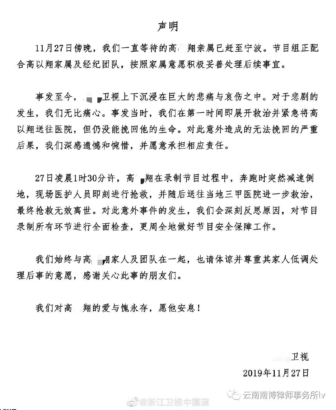 11月27日晚间22时许,XX卫视再发声明,声明中表示,节目组正配合高X翔家属及经纪团队,按照家属意愿积极妥善处理后续事宜。同时他们还表示对造成的无法挽回的严重后果,深感遗憾和惋惜,并愿意承担相应责任。