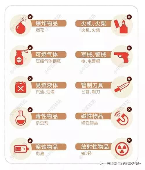一、枪支弹药、管制刀具、易燃易爆物品、腐蚀性物品、剧毒物品以及其他危险品不能带进站乘车。若您在不了解铁路规定的情况下,携带危险物品到站乘车,请及时和民警或车站工作人员取得联系,便于妥善处理,确保大家旅行安全 。(禁止携带)