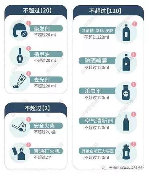 二、防晒喷雾以及冷烫精、摩丝、发胶、空气清新剂等自喷压力容器,属于限量携带物品,只可以携带不超过120毫升;每名旅客最多可携带50条香烟进站乘车,超过数量的须出示相关部门出具的携带证明,符合要求后才可以进站乘车;散装类酒(如散装白酒)是不能通过安检进站上车的,商品类瓶装的酒(未开封)是可以的,携带的数量上限为6瓶装的一箱。注意!白酒度数如果高于50度,旅客只能携带2瓶乘车。如果携带数量超出标准,您可以在车站办理托运;有强烈刺激性气味的物品,或者带有异味的物品也不能携带。(限量携带)