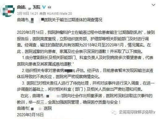 通报称,3月14日,该院肿瘤科护士在输液过程中给患者输注“过期脂肪乳剂”,经调查,输注的脂肪乳剂有效期为2018年2月至2020年1月,情况属实。医院诚挚向患者、家属及社会表示深深的道歉,并采取了以下措施: