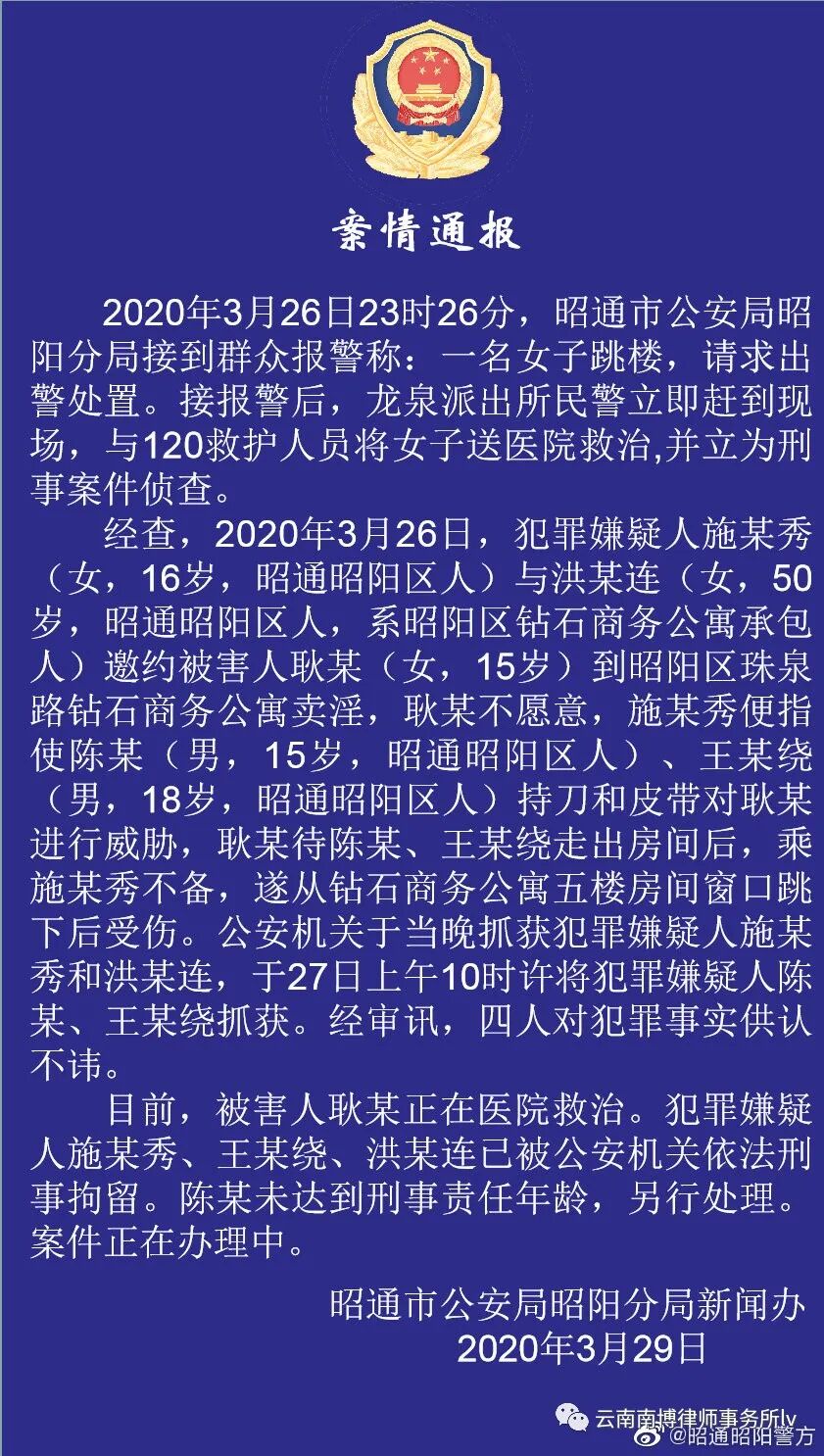 据@昭通昭阳警方 今日(3月29日)通报:经査,2020年3月26日,犯罪嫌疑人施某秀(女,16岁)与洪某连(女,50岁,系昭阳区某商务公寓承包人)邀约被害人耿某(女,15岁)到昭阳区珠泉路钻石商务公寓卖淫,耿某不愿意,施某秀便指使陈某(男,15岁)、王某绕(男,18岁)持刀和皮带对耿某进行威胁,耿某待陈某、王某绕走出房间后,趁施某秀不备,遂从该商务公寓五楼房间窗口跳下后受伤。公安机关于当晚抓获犯罪嫌疑人施某秀和洪某连,于27日上午10时许将犯罪嫌疑人陈某、王某绕抓获。经审讯,四人对犯罪事实供认不讳。