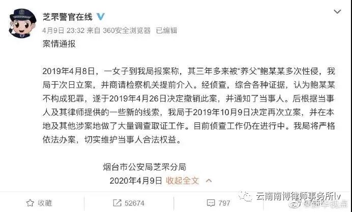 芝罘分局通报,2019年4月8日,一女子报案,称三年多来被“养父”鲍某某多次性侵。公安部门于次日立案,并商请检察机关提前介入。后经侦查,认为鲍某某不构成犯罪,遂于2019年4月26日决定撤销此案,并通知当事人。后根据当事人及其律师提供的一些新的线索,芝罘分局于2019年10月9日决定再次立案,并在本地及其他涉案地调查取证,目前侦查工作仍在进行中。