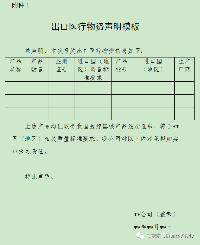 根据《商务部 海关总署 国家药品监督管理局关于有序开展医疗物资出口的公告》(2020年第5号公告)当前,全球疫情呈加速扩散蔓延态势。在做好自身疫情防控的基础上,有序开展医疗物资出口是深化疫情防控国际合作、共同应对全球公共卫生危机的重要举措。在疫情防控特殊时期,为有效支持全球抗击疫情,保证产品质量安全、规范出口秩序,自4月1日起,出口新型冠状病毒检测试剂、医用口罩、医用防护服、呼吸机、红外体温计的企业向海关报关时,须提供书面或电子声明,(如下图)