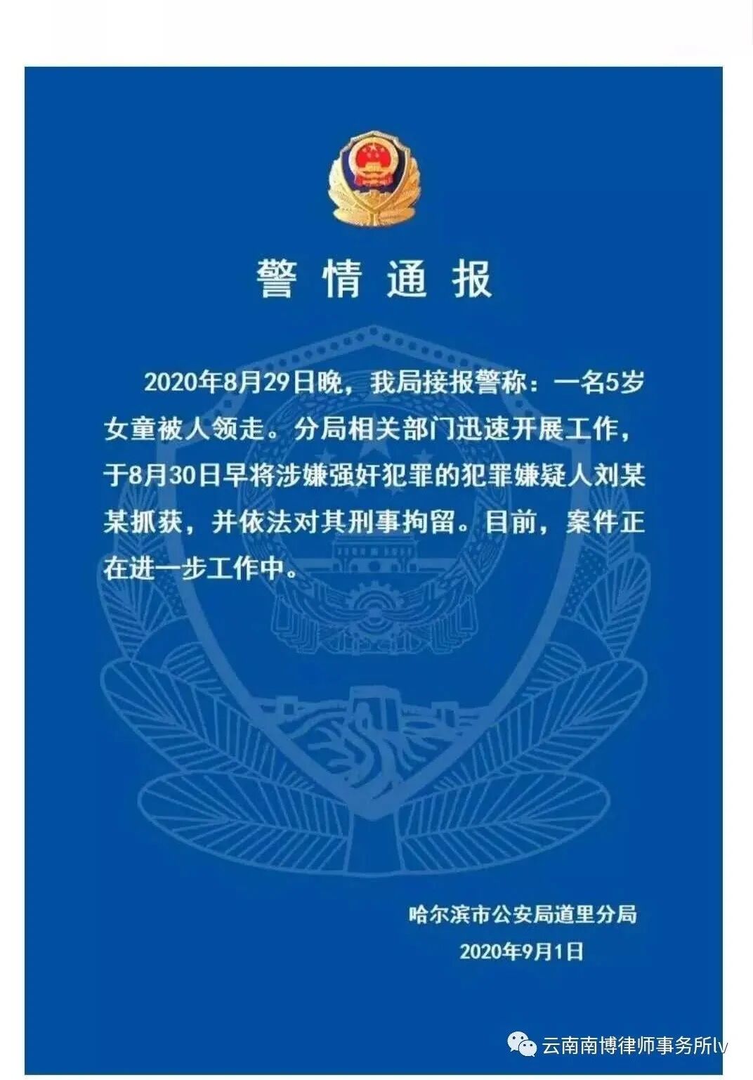 9月3日18时许,哈尔滨市道里区人民检察院微信公众号“道里检察”通报:8月29日,黑龙江省哈尔滨市道里区发生一起性侵幼女案件。9月3日,哈尔滨市道里区人民检察院以涉嫌强奸罪、猥亵儿童罪对犯罪嫌疑人刘某某批准逮捕。