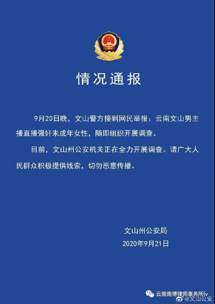 9月21日下午,文山州公安局发布情况通报称,目前,文山州公安机关正在全力开展调查。请广大人民群众积极提供线索,切勿恶意传播。