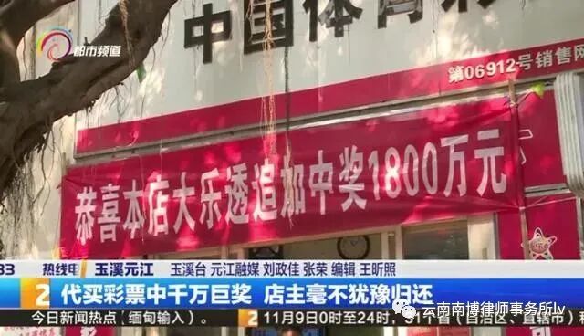 11月9日晚上,玉溪元江县一体育彩票销售网点店主受人之托代买了一张彩票,结果中了1800万大奖。在这家体育彩票销售网点,门口悬挂的中奖横幅格外显眼,店主夫妻俩正在给围观的市民发放喜糖。店主丁先生介绍,11月9日傍晚七点多钟,一位熟识的彩民通过微信请他代买了一张超级大乐透彩票,没想几个小时候后的开奖结果让他们大吃一惊。