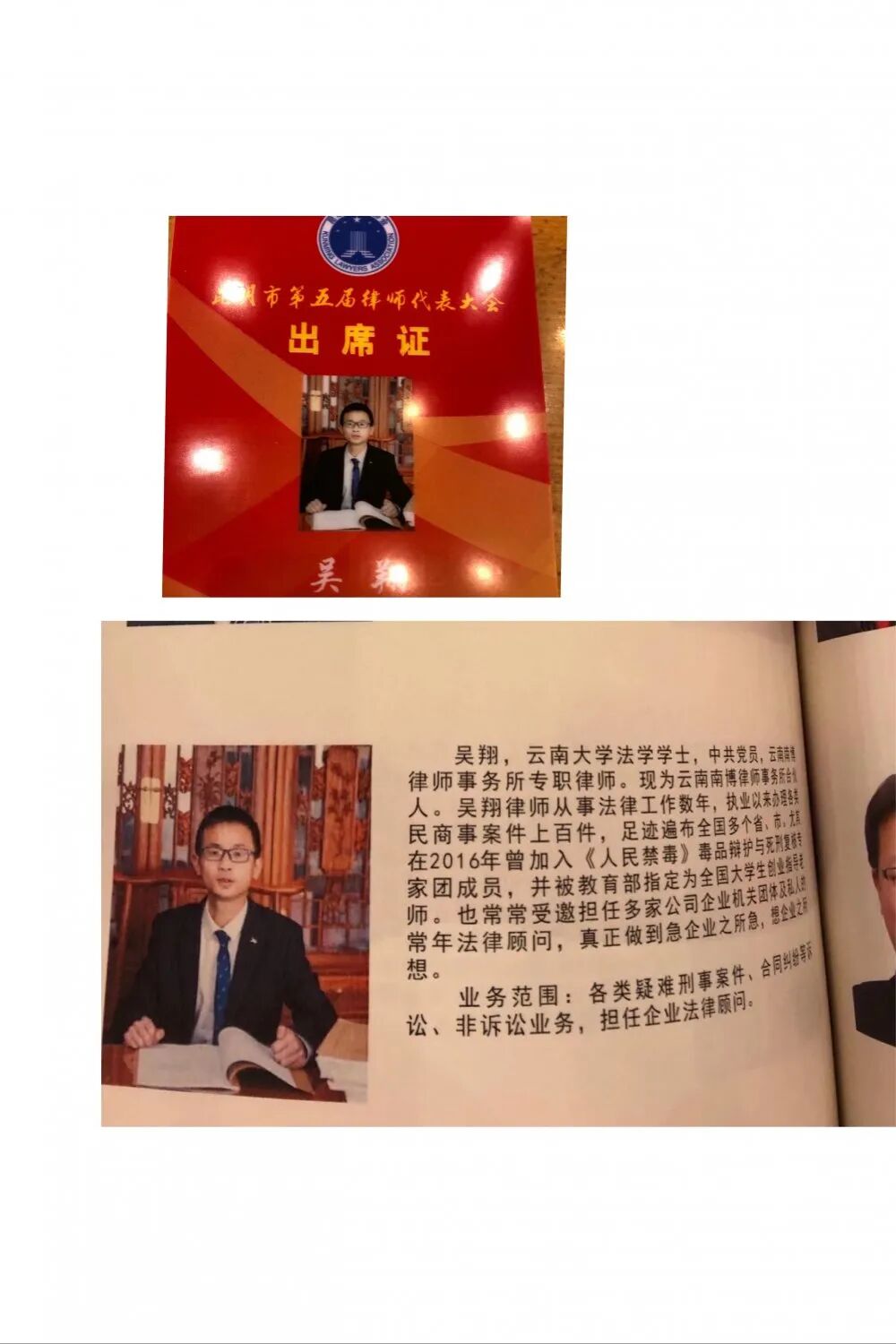 吴翔,云南大学法学学士,中共党员,云南南博律师事务所专职律师,现为云南南博律师事务所合伙人。吴翔律师从事法律工作数年,执业以来办理各类民商事案件上百件,足迹遍布全国多个省、市。尤其在2016年曾加入《人民禁毒》毒品辩护与死刑复核专家团成员,并被教育部指定为全国大学生创业指导老师。也常常受邀担任多家公司企业机关团体及私人的常年法律顾问,真正做到急企业之所急,想企业之所想。