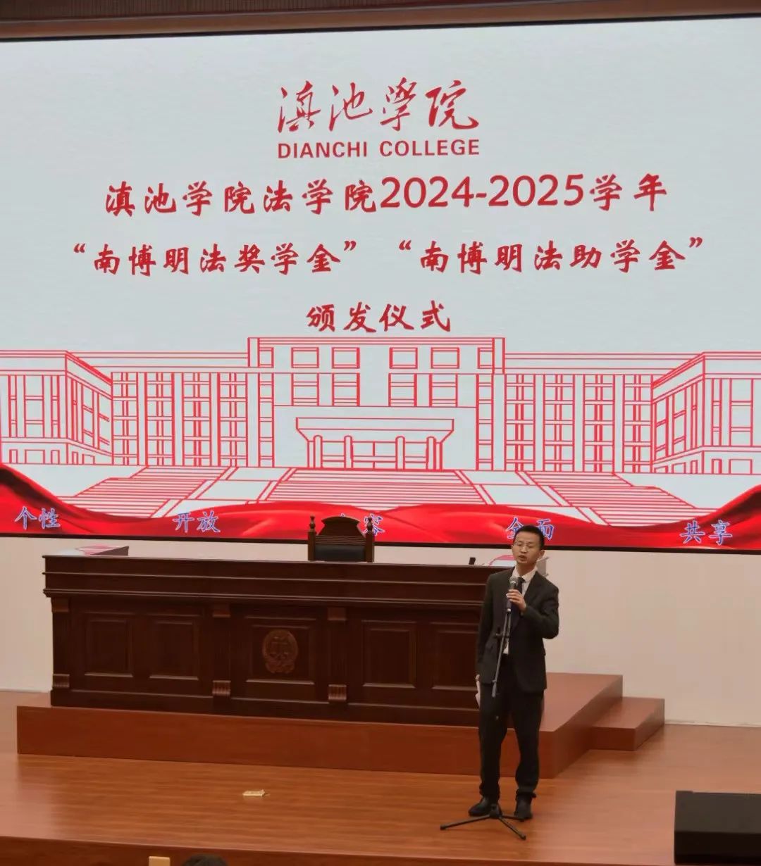 为积极践行社会责任,助力法学教育发展,激励莘莘学子勤学奋进,2025年7月2日,云南南博律师事务所党支部书记吴翔律师作为律所代表,满怀热忱回到母校滇池学院杨林校区,隆重举行2024-2025学年“南博明法奖学金”“南博明法助学金”颁发仪式。