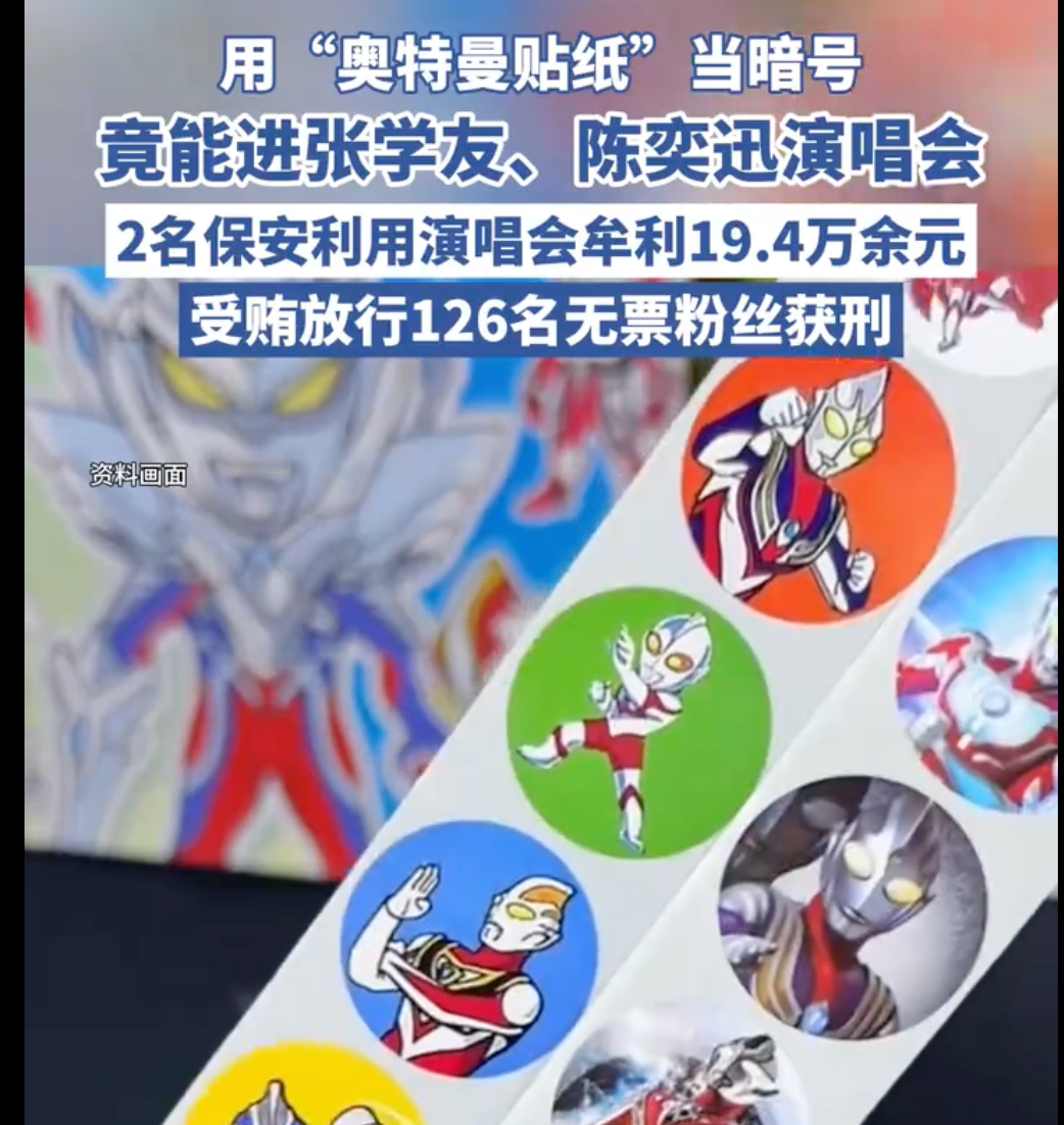 2023年9月张学友武汉演唱会期间及2024年4月至5月陈奕迅武汉演唱会期间,负责演唱会部分验票服务及安保人员调配业务的赵某,与王某共谋非法牟利。二人商定,由王某在社交平台招揽买不到票的粉丝,向每位粉丝收取1500至2000元费用,同时发放奥特曼贴纸作为识别暗号,要求粉丝将贴纸贴在身份证边角,并从赵某招募的临时保安李某、许某值守的特定安检闸口入场。李某、许某在收受利益后,对持有带奥特曼贴纸身份证的无票人员直接放行。经查明,二人通过该方式先后放行126名无票粉丝,非法获利共计19.4万余元。案发后,赵某、王某及李某、许某相继被抓获,检察机关以非国家工作人员受贿罪对赵某、王某提起公诉,李某、许某因情节轻微且具有从轻情节被作出不起诉决定。最终,法院判处赵某有期徒刑一年并处罚金三万元,王某有期徒刑十个月并处罚金一万元,判决已发生法律效力。(今日头条)