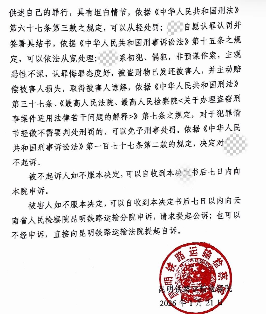 最终,昆明铁路运输检察院采纳全部辩护意见,依法对受援人作出相对不起诉决定。未来,云南南博律师事务所将继续携手昆明市法律援助中心,深耕法律援助领域,让更多律师的专业技巧转化为弱势群体的维权力量,以专业担当践行法治初心,为社会和谐稳定注入更多司法温情。